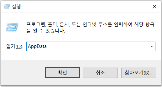 7. 윈도우키 + R 눌러서 AppData 입력하고 확인 누르세요.