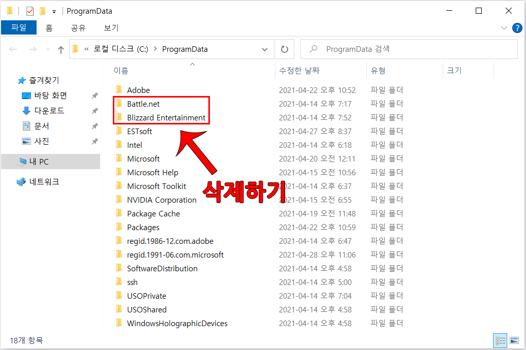 6. Battle.net, Blizzard Entertainment 폴더를 삭제합니다.