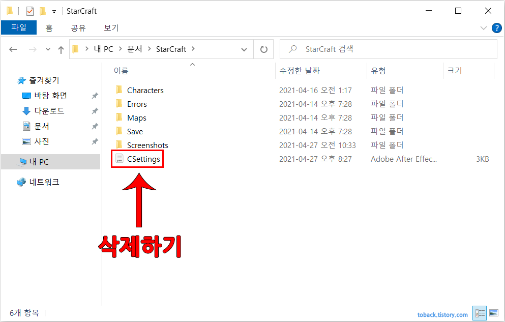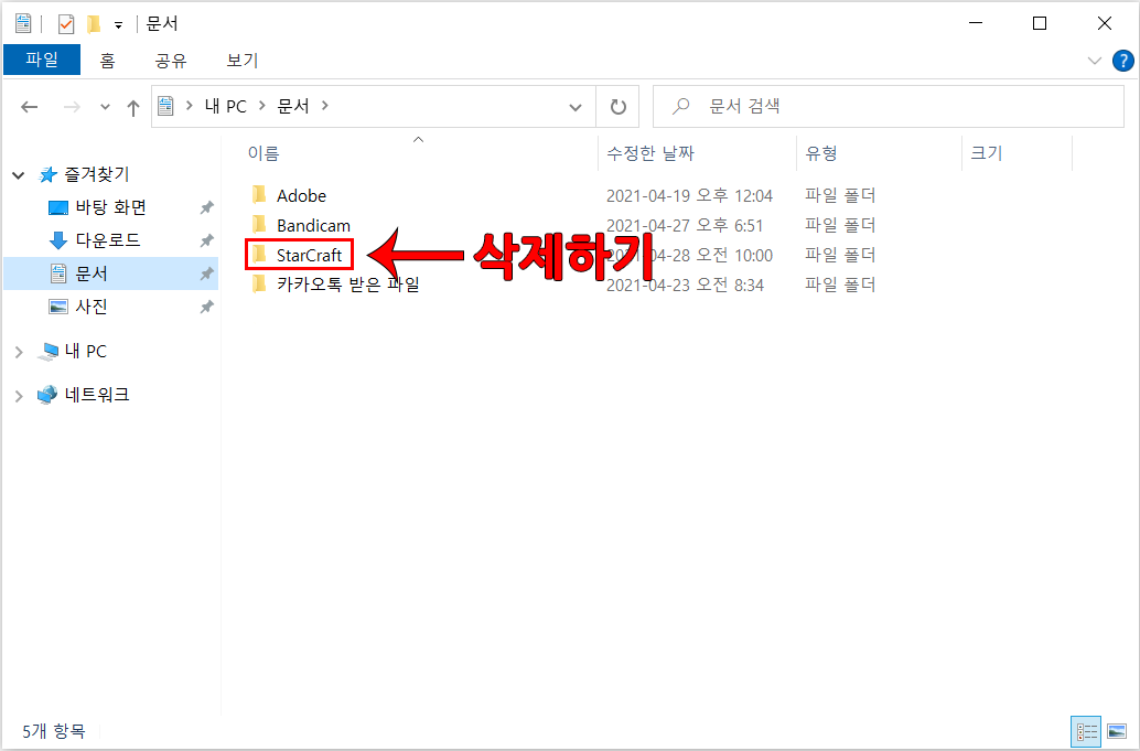 9. 문서에서 StarCraft 폴더를 삭제합니다.