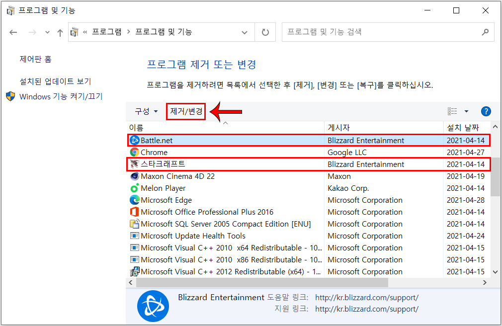 4. 프로그램 제거 목록에서 블리자드 게임과 Battle.net 선택하고 제거하세요.