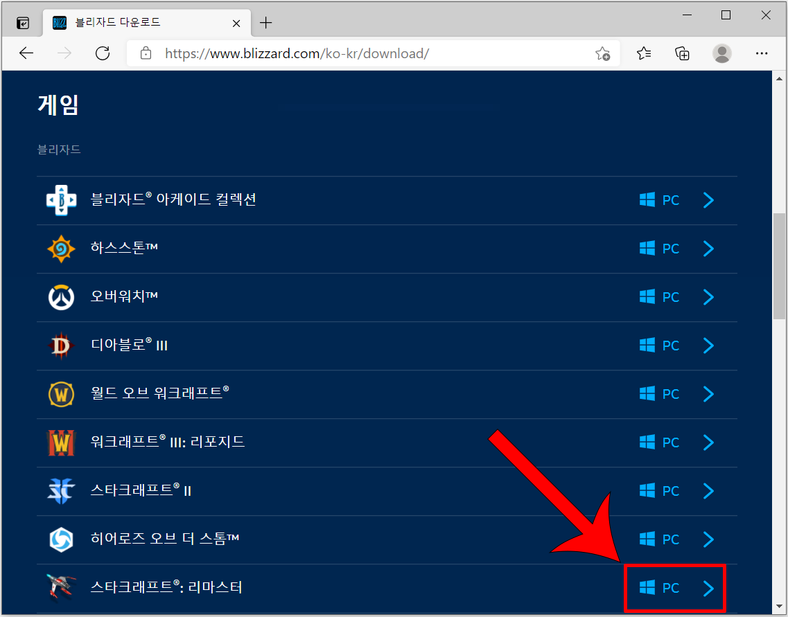 11. 게임에서 스타크래프트 리마스터 PC 클릭합니다.