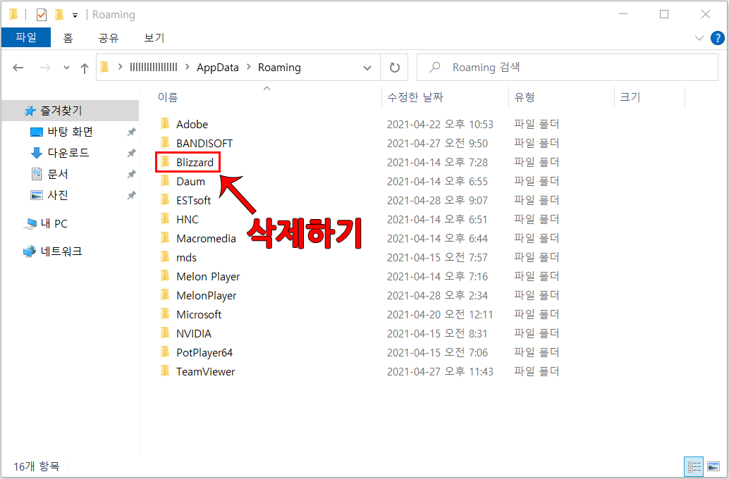 Roaming 폴더 안에 있는 Blizzard 폴더를 삭제합니다.