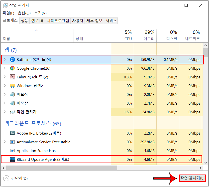 2. 프로세서에서 Battle.net, Agent.exe 선택 한 후 프로세서 끝내기를 클릭합니다.